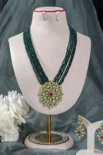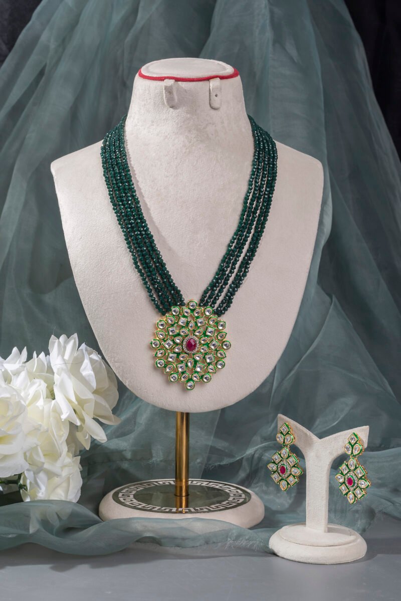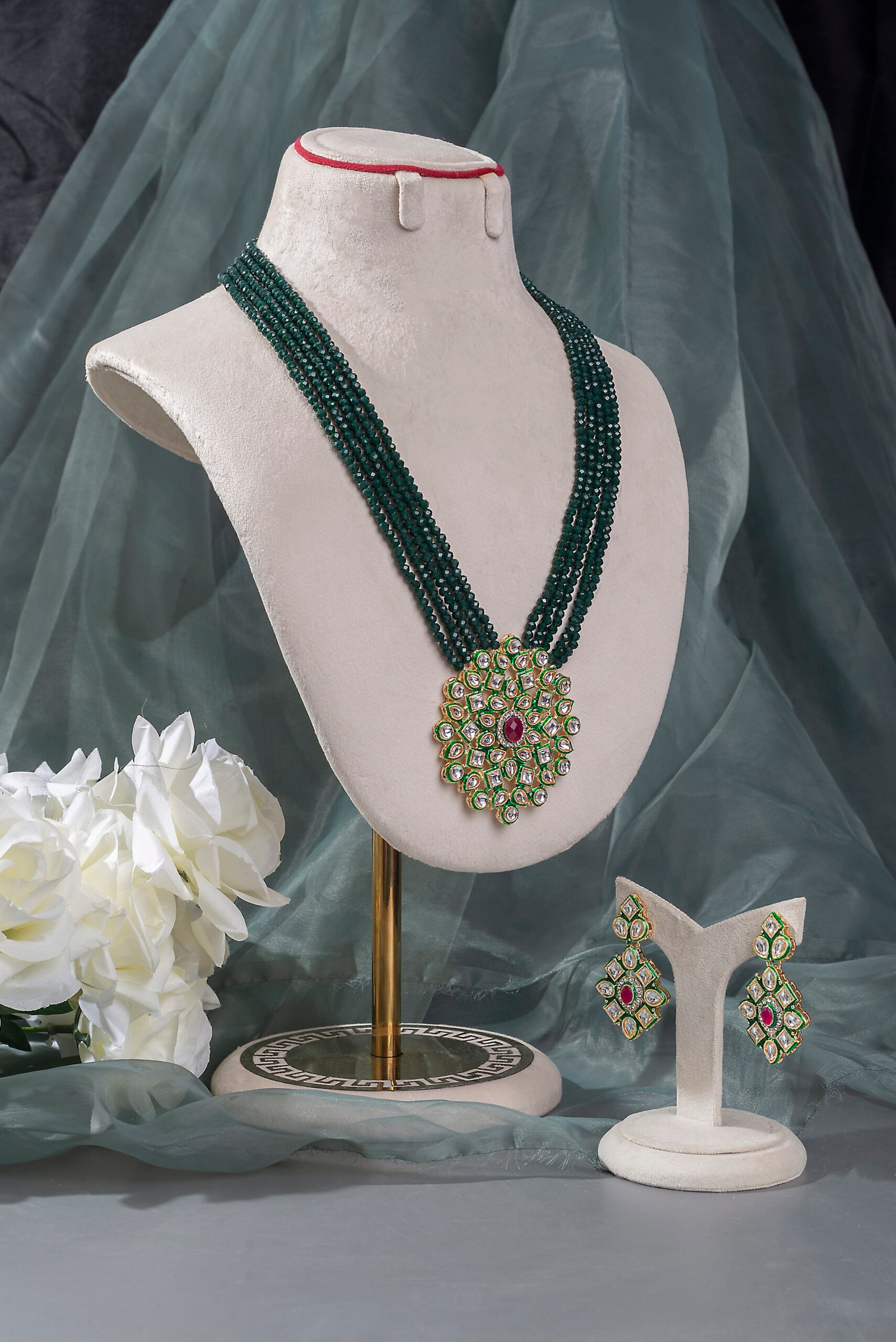 5 Layered Emerald Onyx Crystal Beads Long Necklace Jewellery Set.
