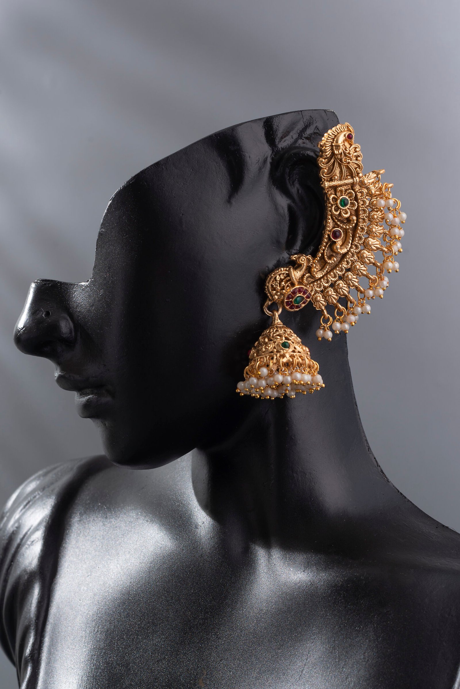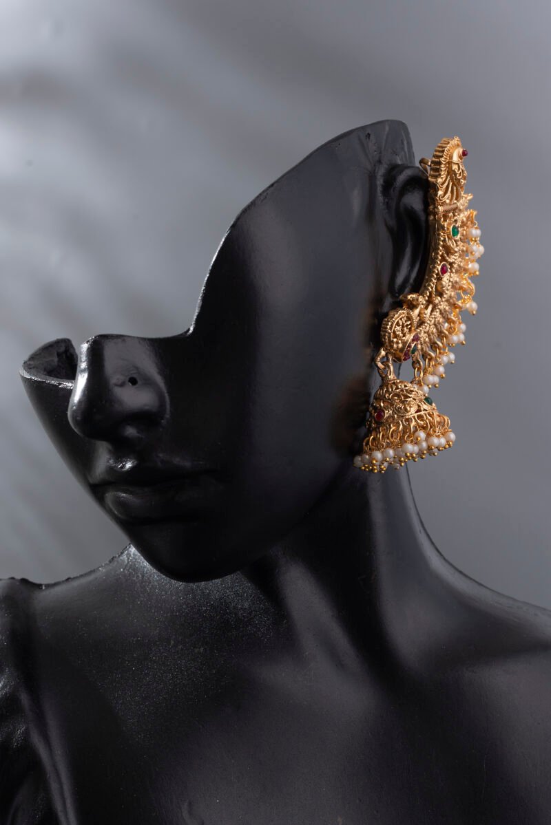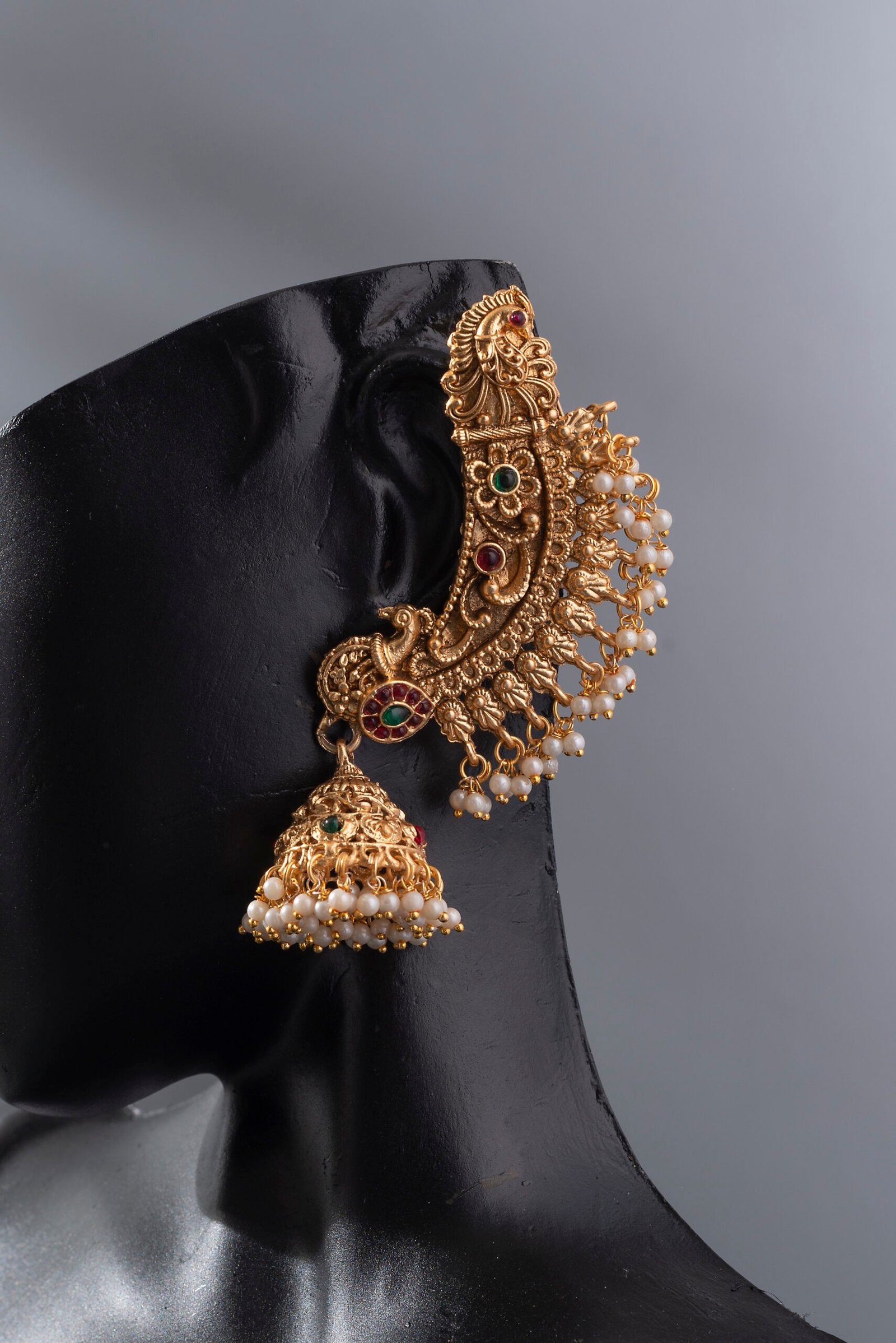 24K Gold-Plated Traditional Peacock Ruby and Emerald Jhumka Earrings.