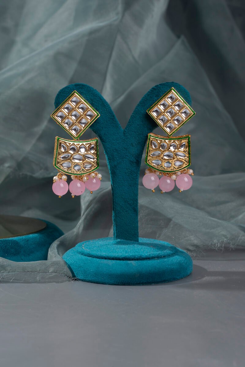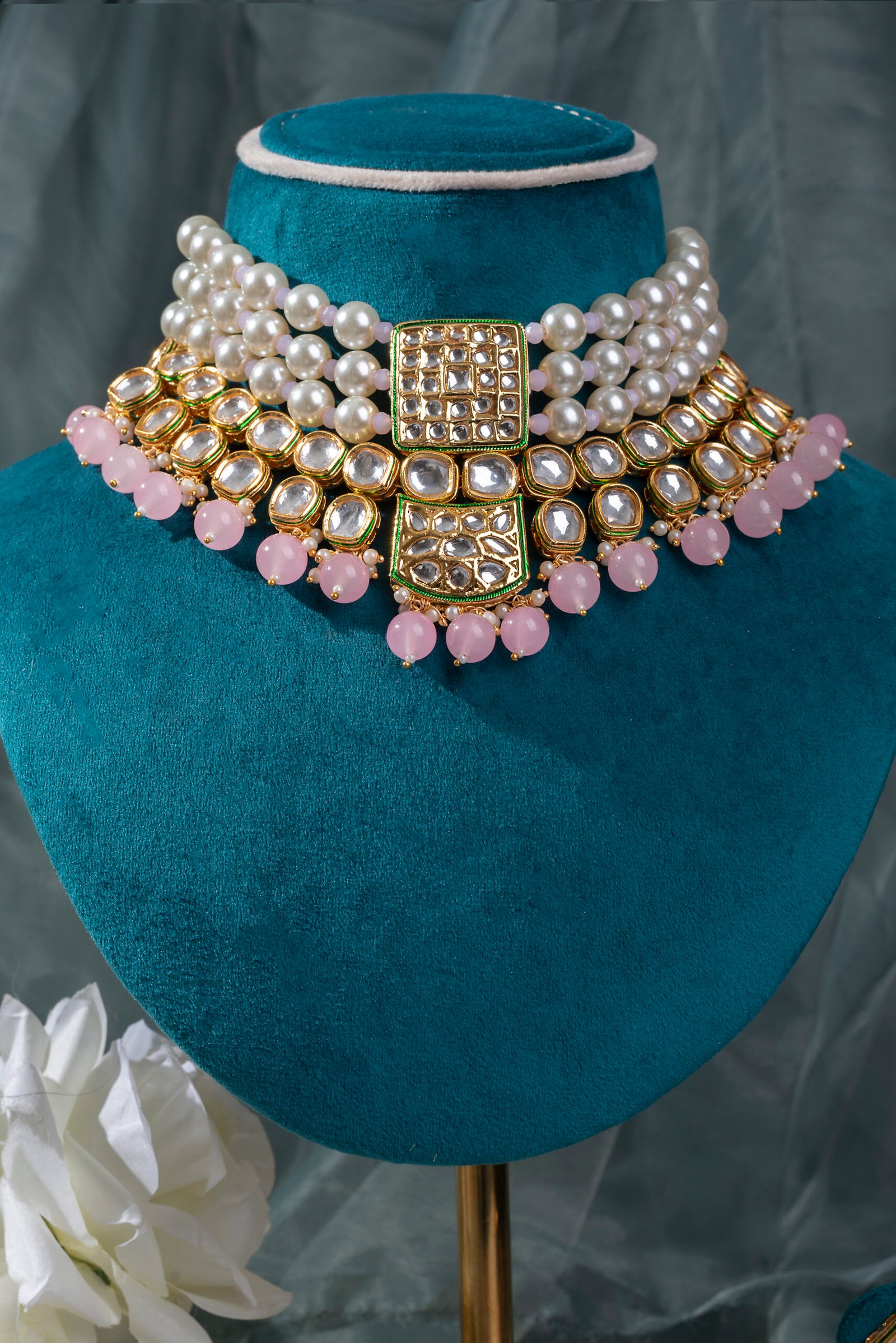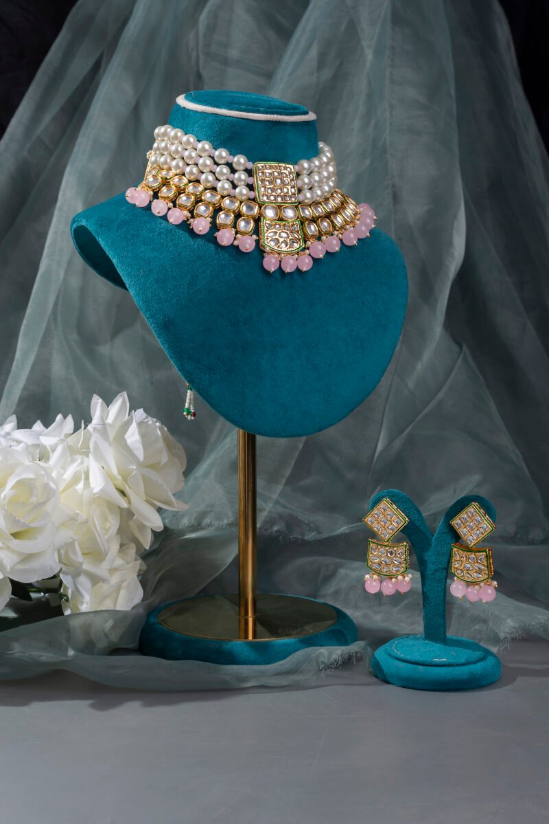 Pink Pearl Beads Statement Kundan Choker Necklace with Gold Plated Earrings Jewellery Set.