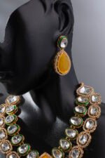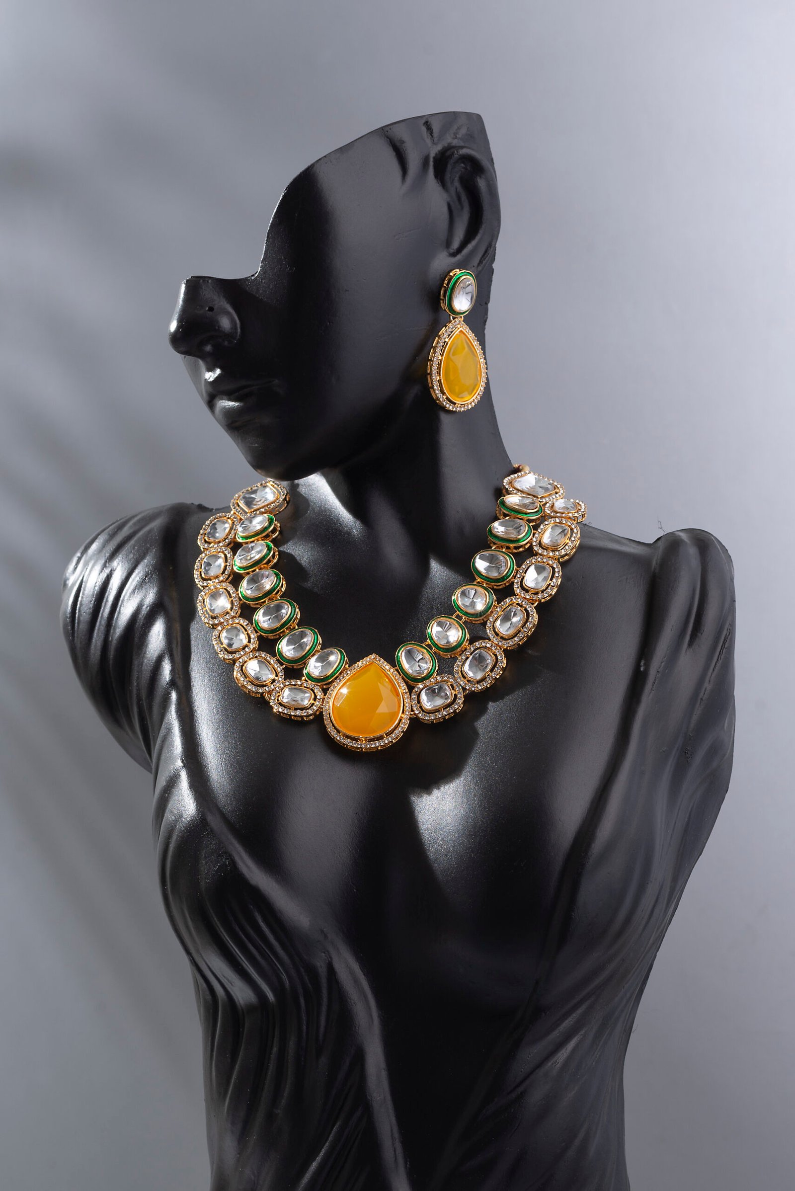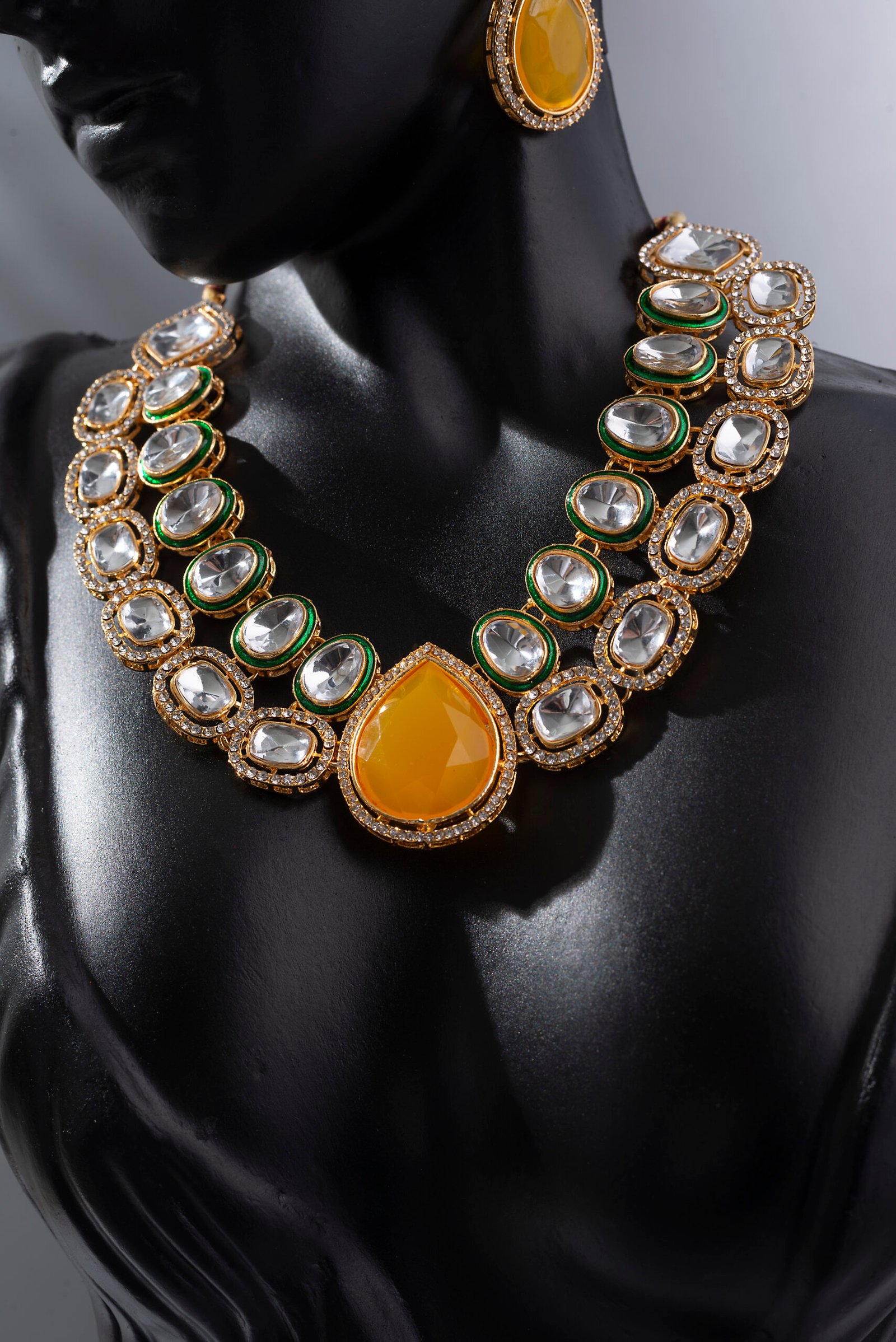 Yellow Stone Green Meenakari Diamonds Necklace and Earring Set.