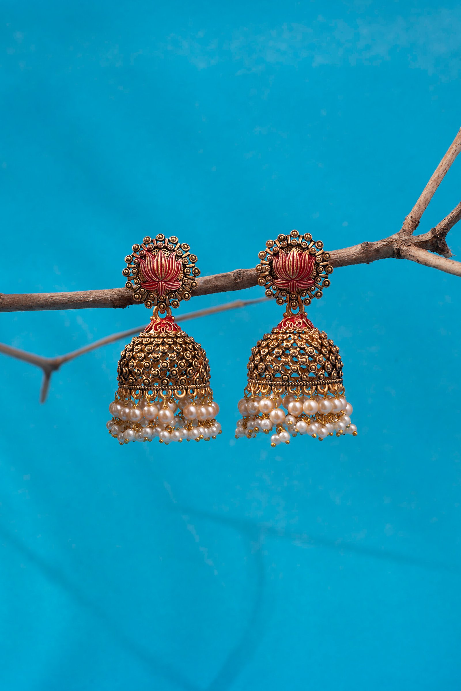 Antique Gold-Plated Red Hand-Painted Pearl Floral Jhumka Earrings.