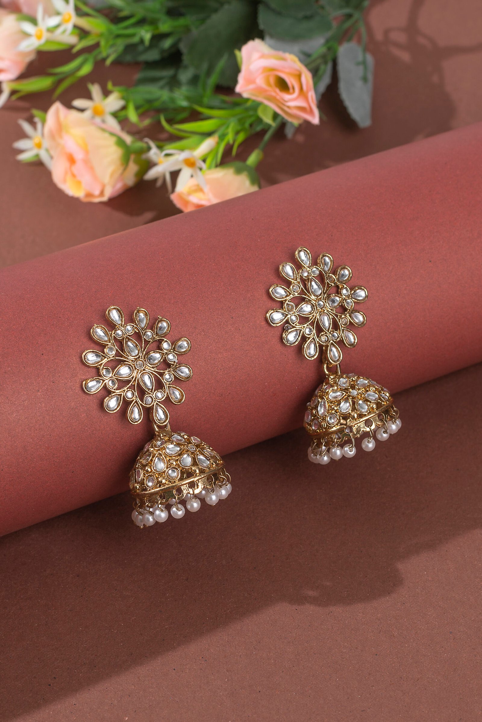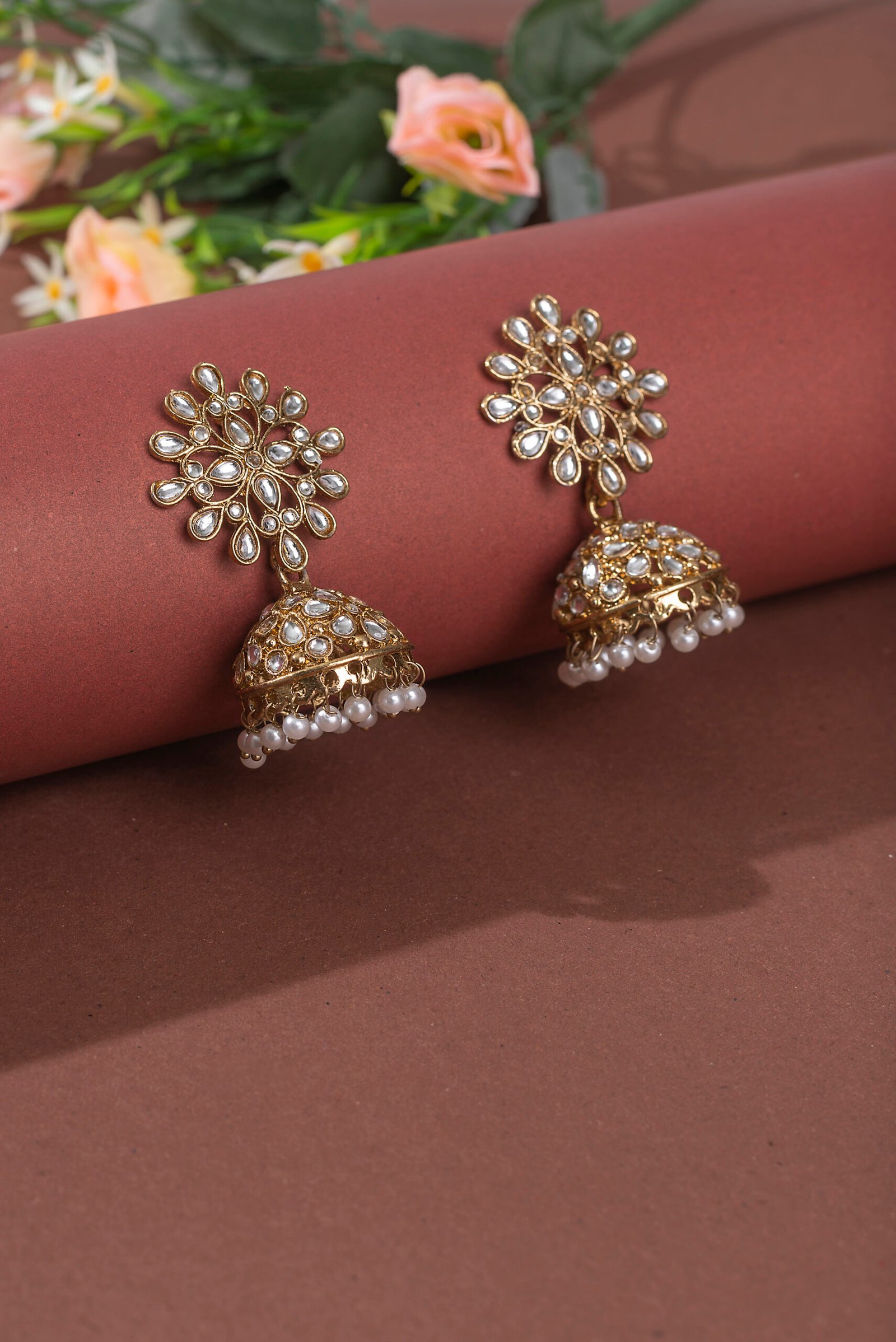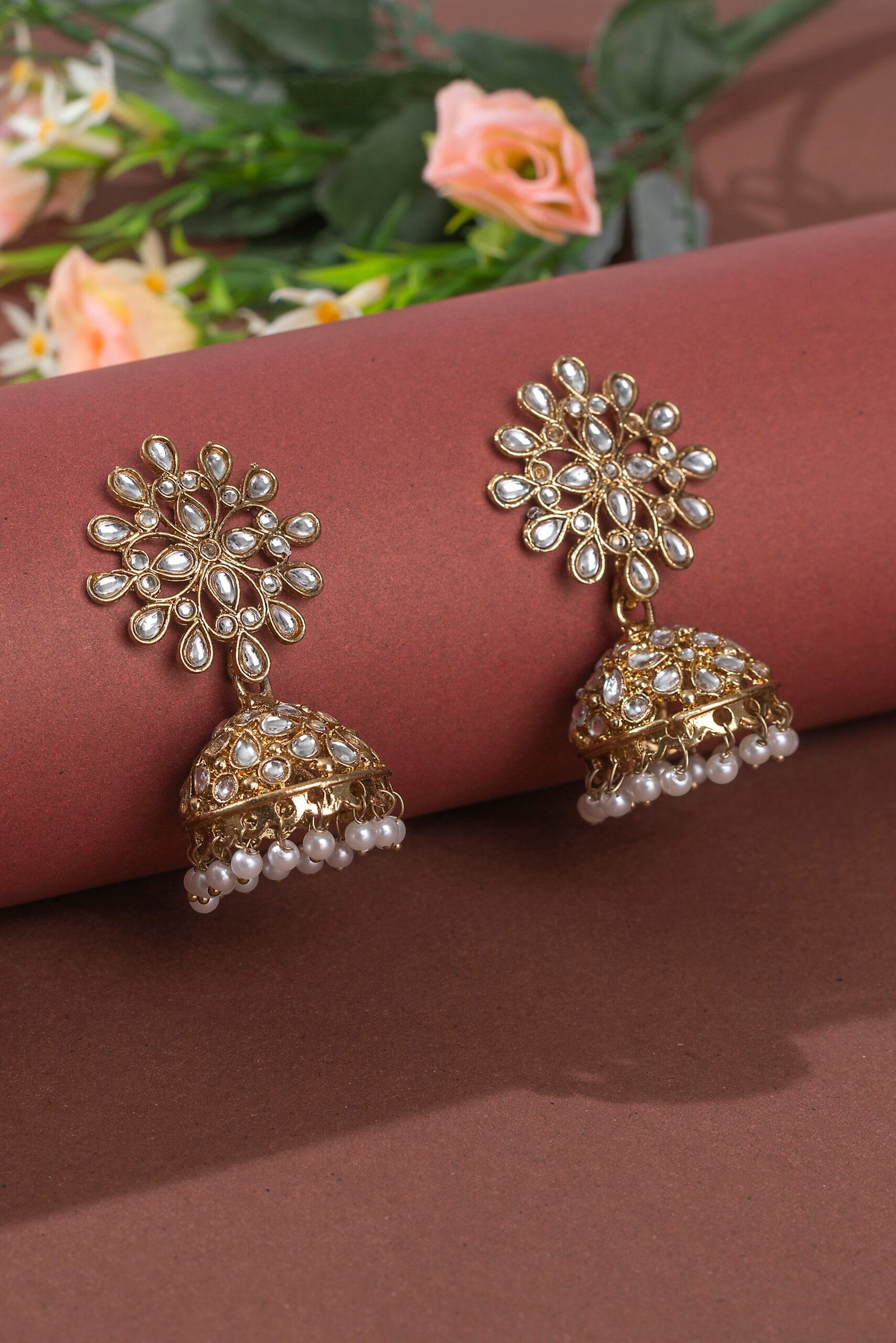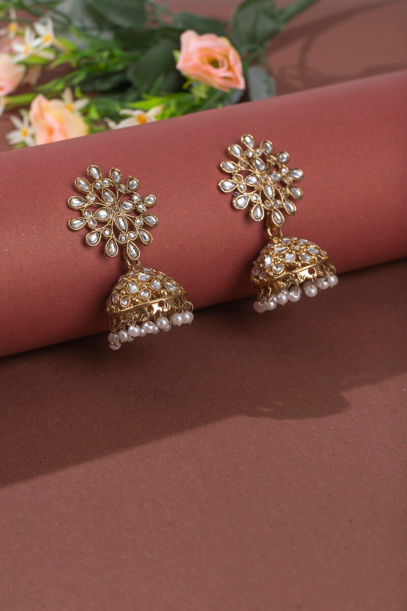 Wedding Ethnic Indian Gold Kundan Stone Jhumka Drop Earrings.