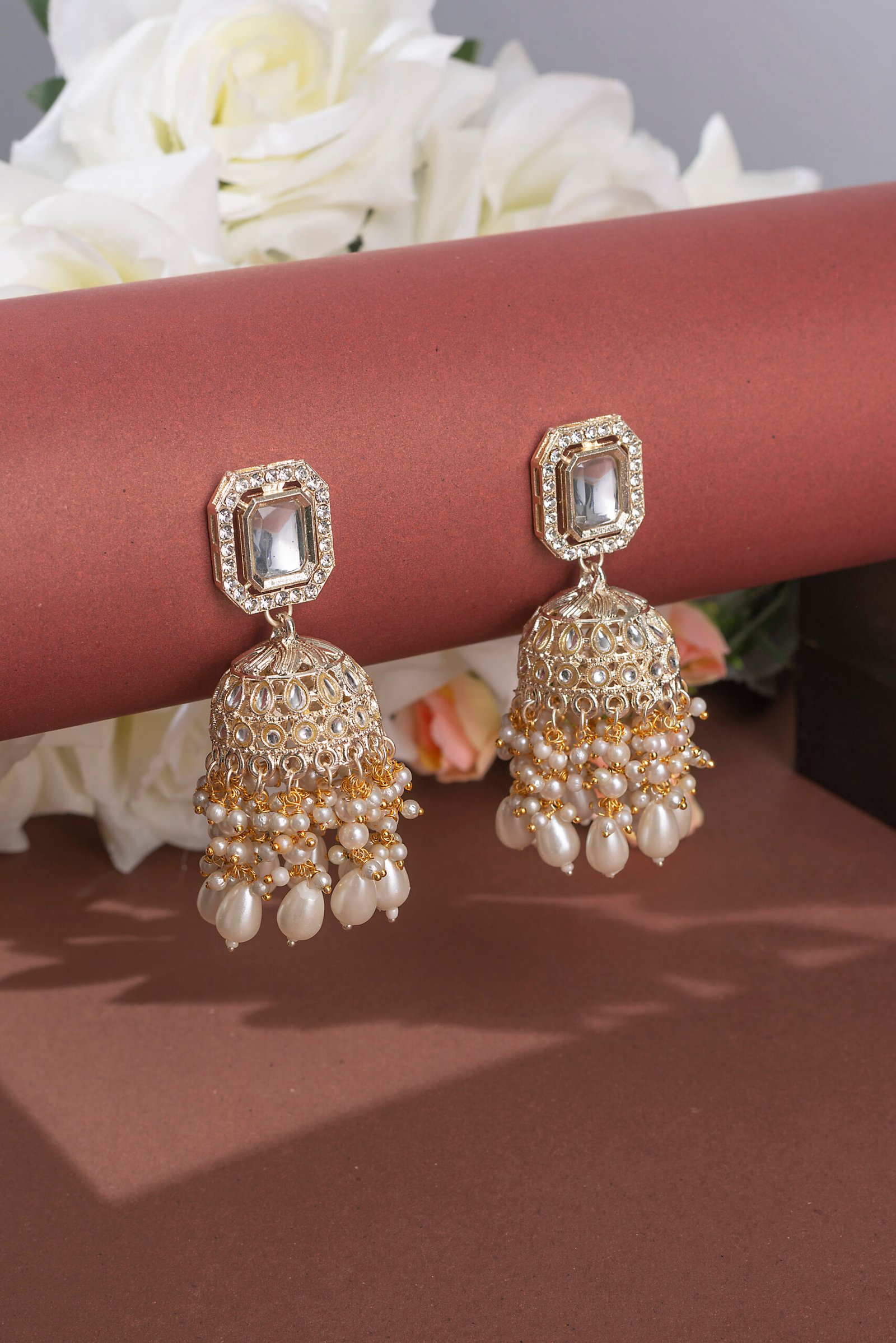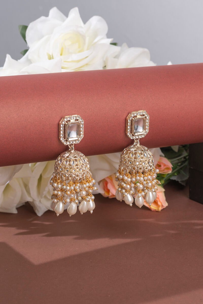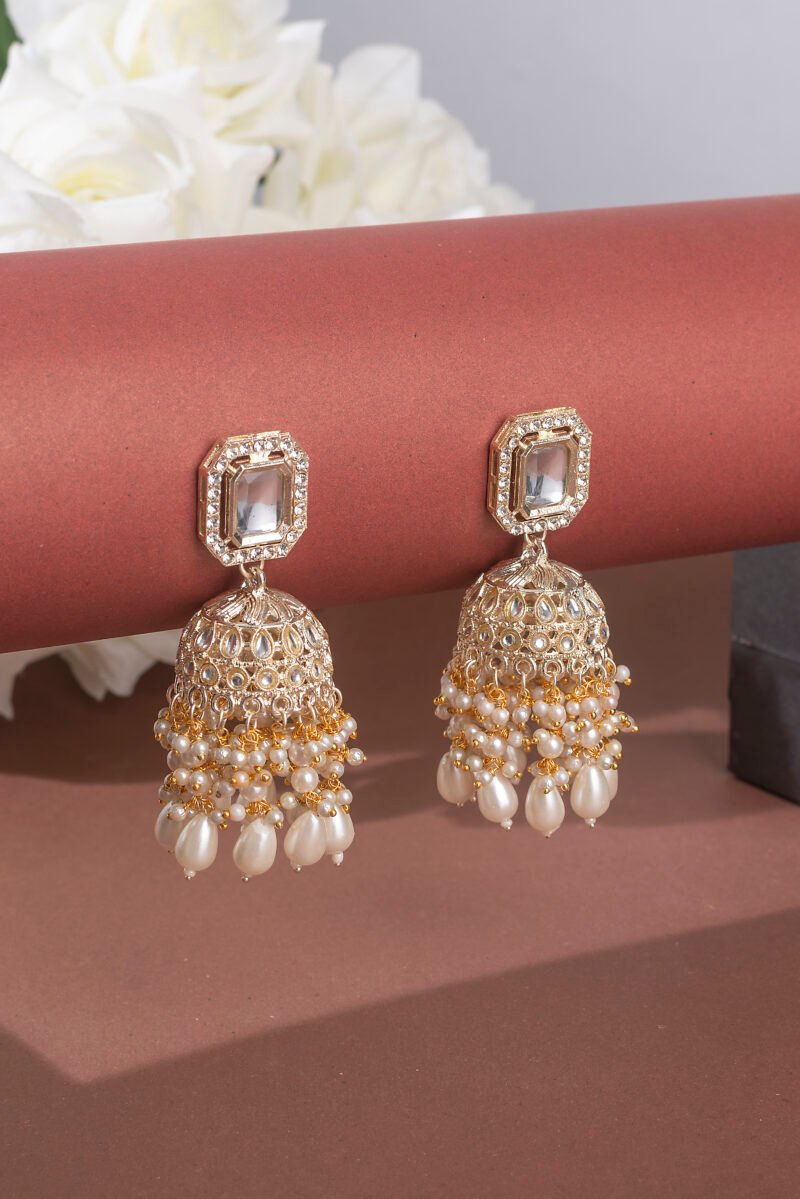 Gold Tone Stones and Clustered Beads Drop Jhumka Earrings.