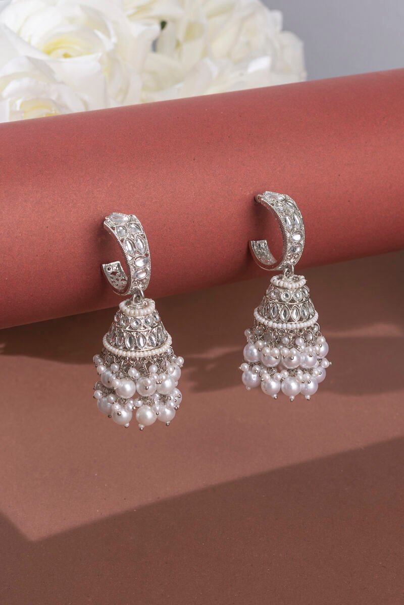 Silver Tone Jadau Kundan & Pearl Ethnic Large Drop Jhumka Earrings.