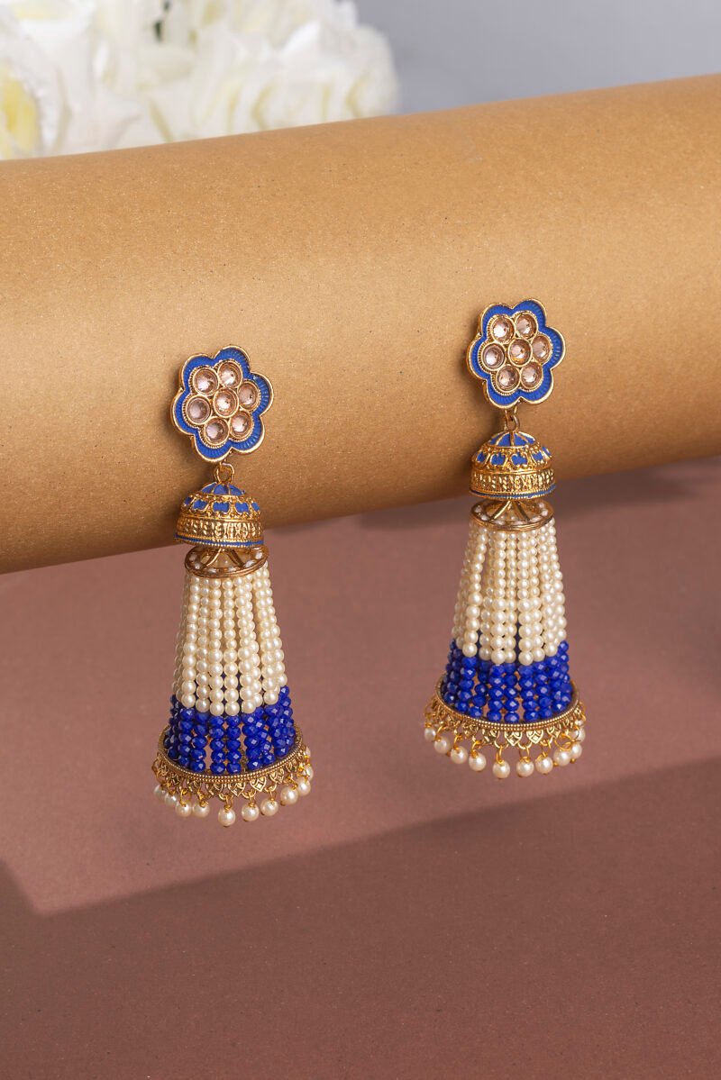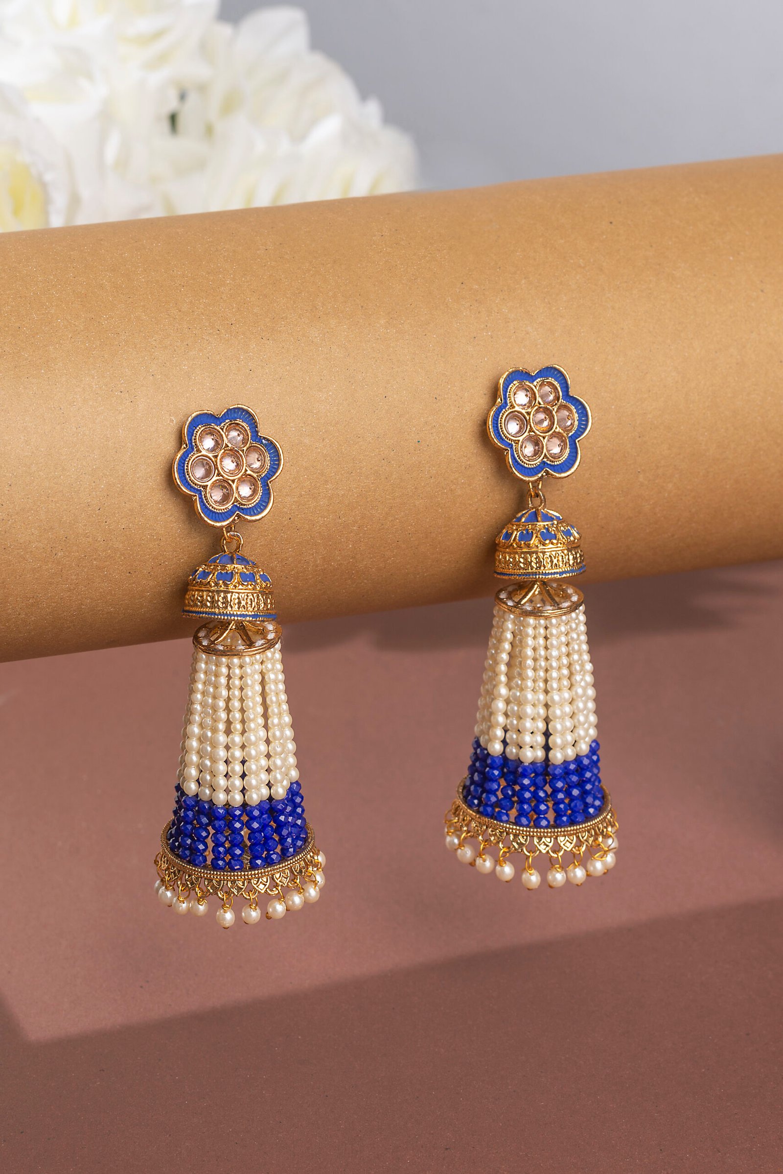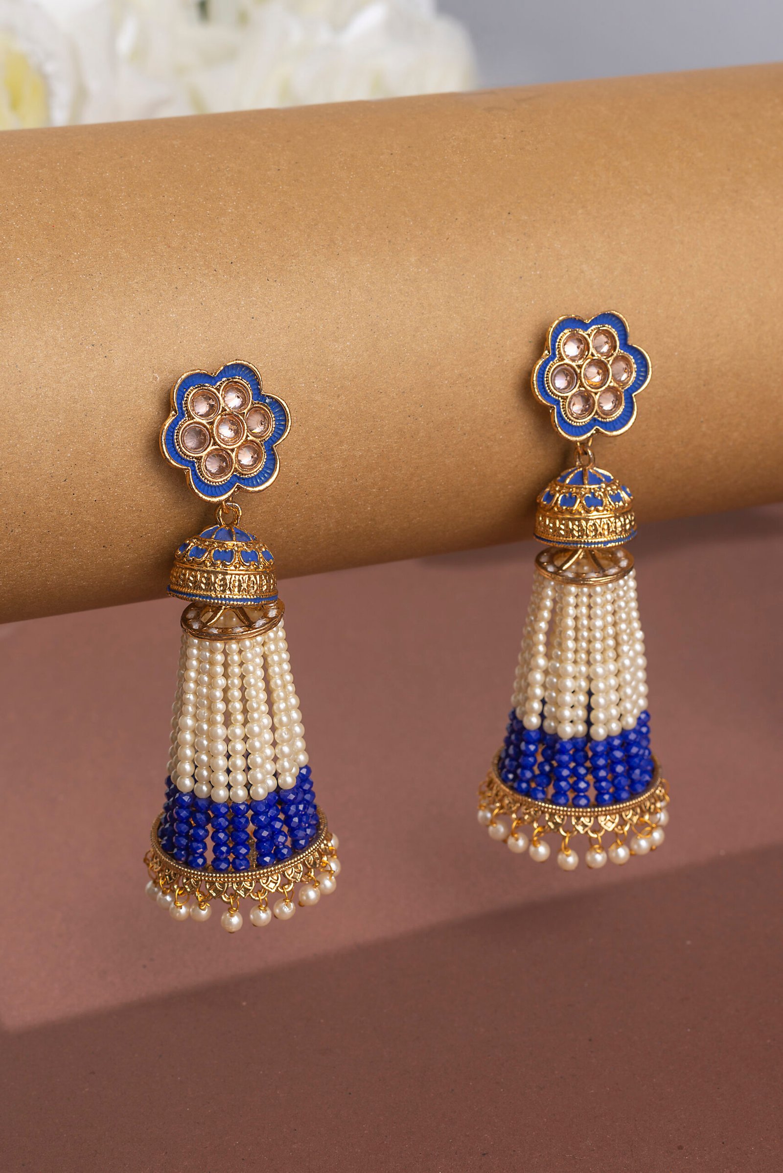 Gold Plated Blue Stones & Pearls Studded Long Jhumka Earrings For Women.