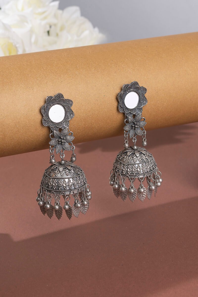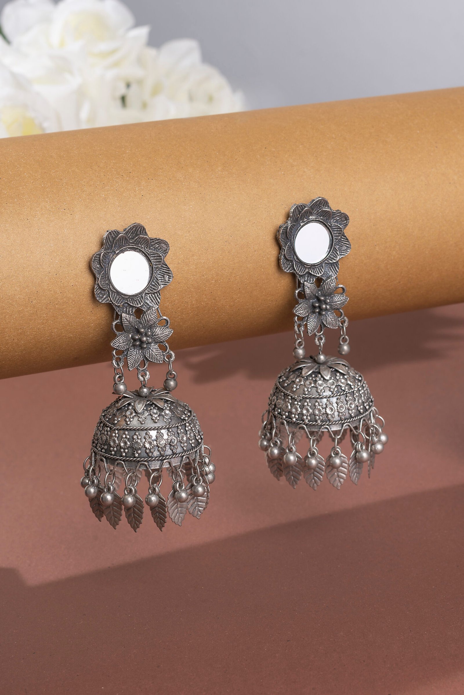 Silver-Toned Oxidised Mirror Work Contemporary Jhumkas Earrings.