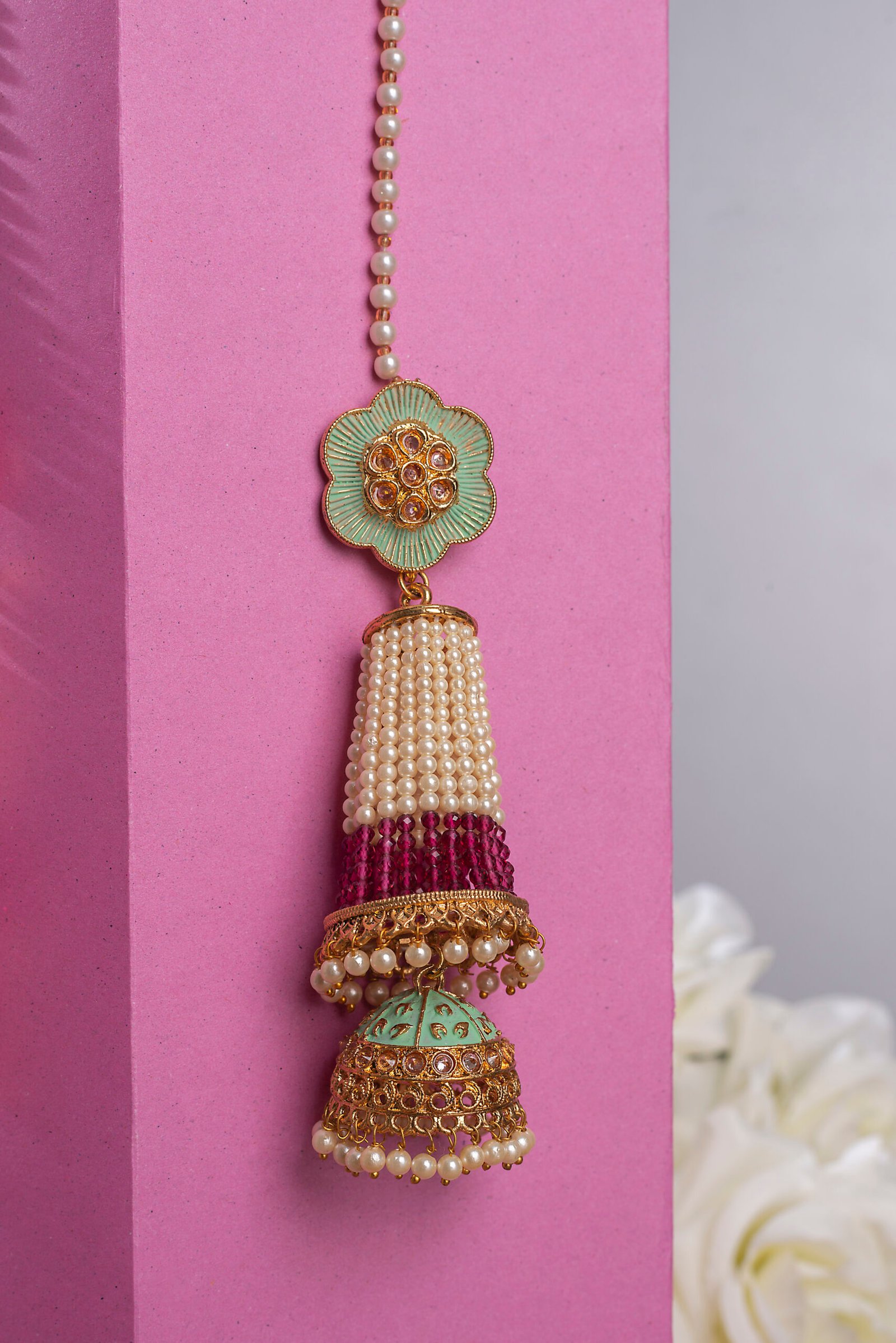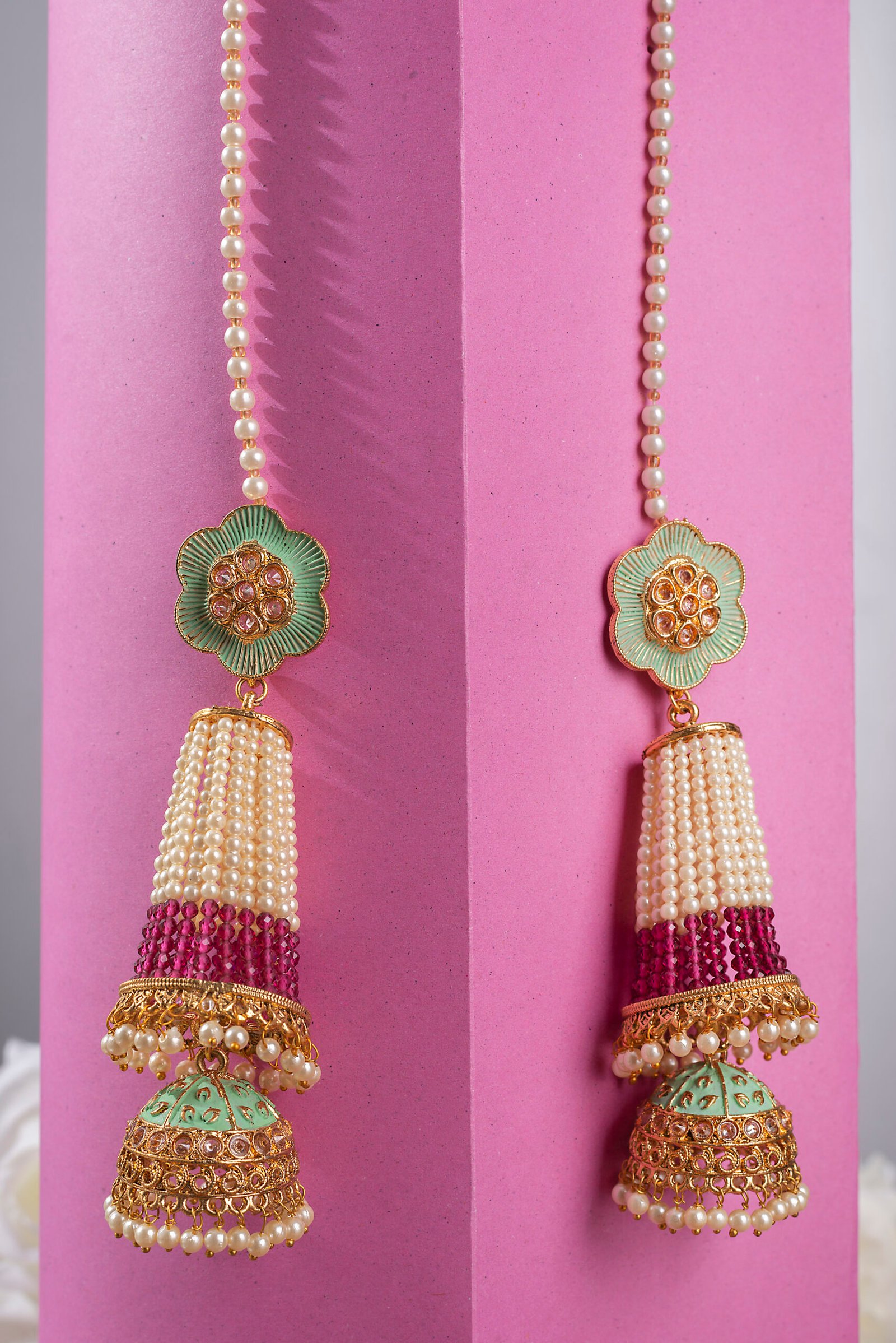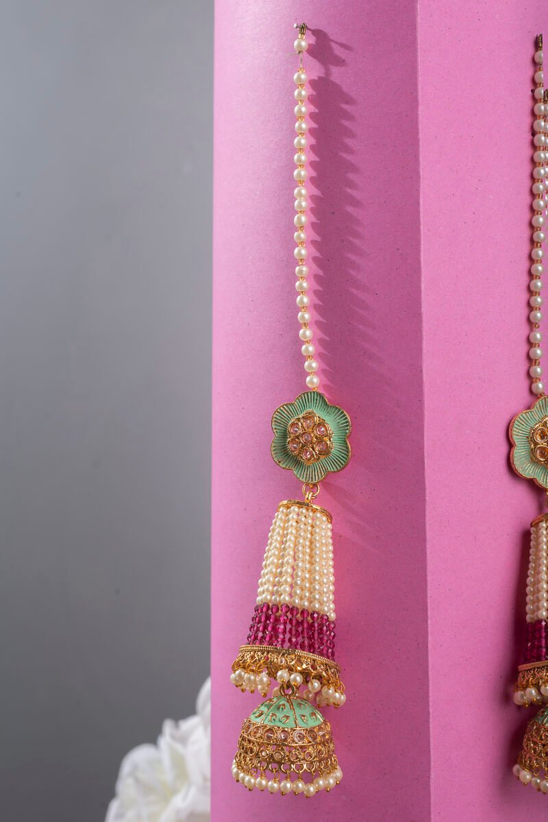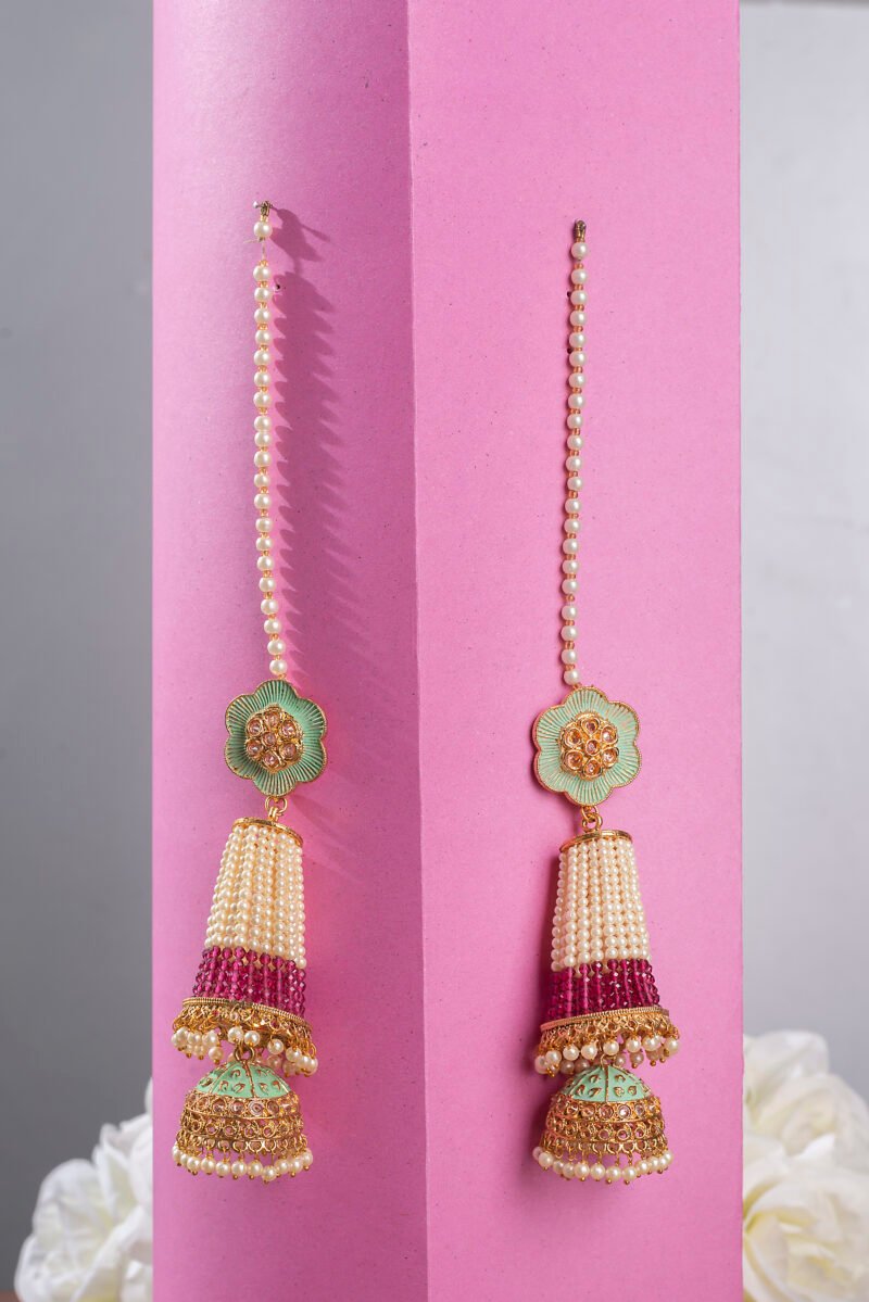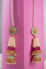 Gold Plated Light Green Stones Mehroon & White Pearls Studded Long Jhumka Earrings For Women.