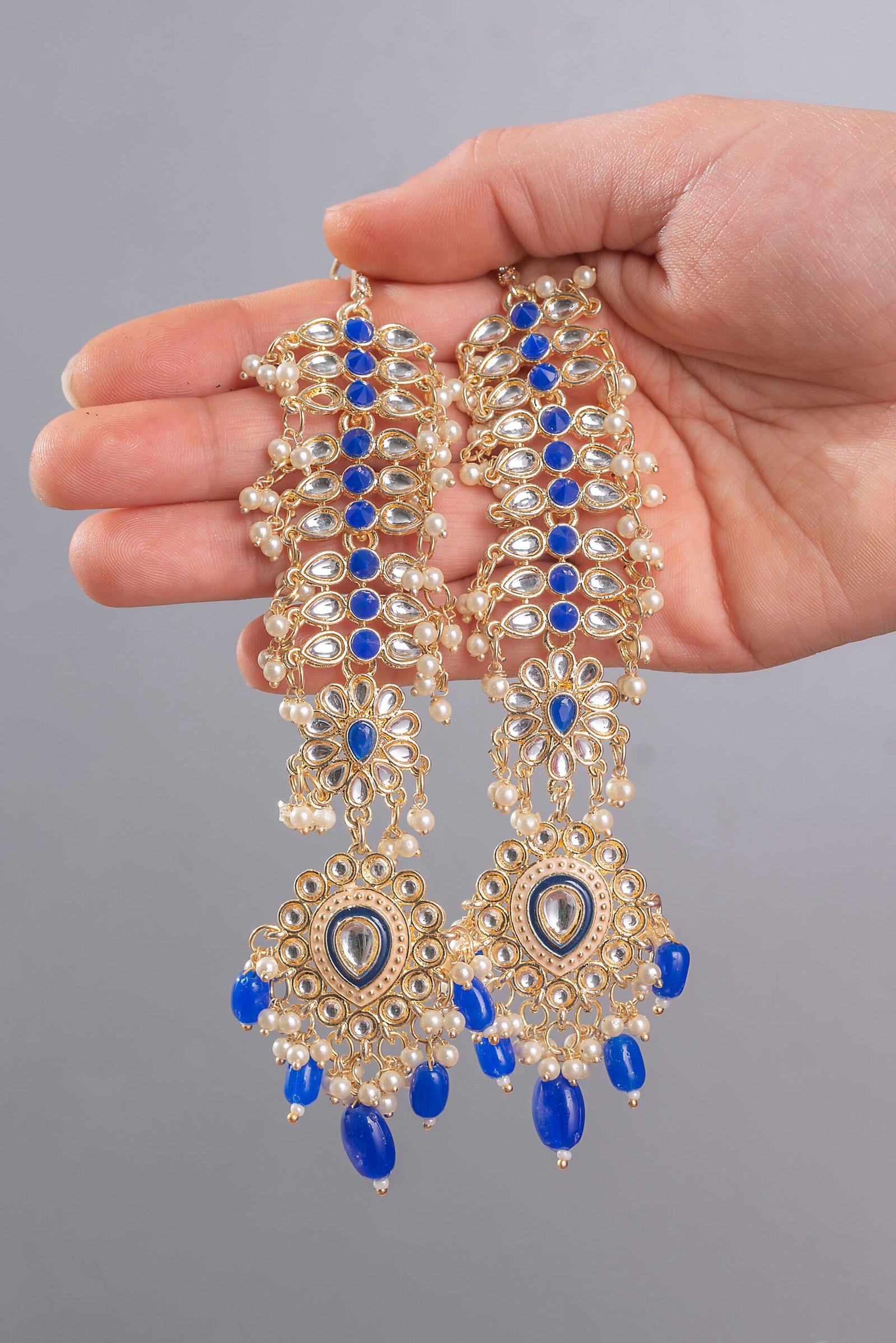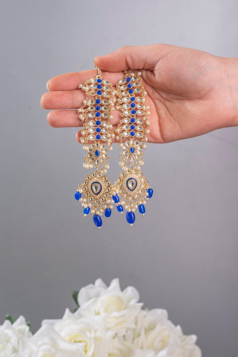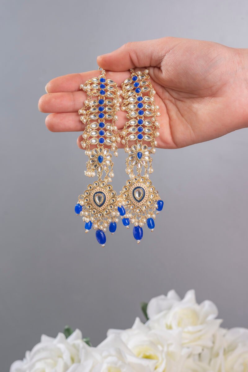 Wedding Gold Plated Navy Stone Earrings with Ear Chain For Women.